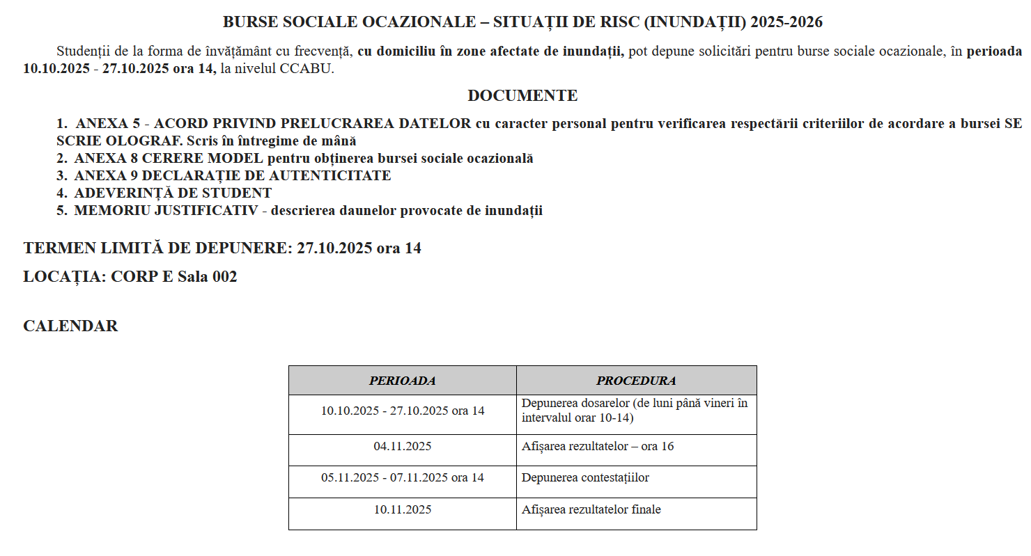 - Lista studenților care pot beneficia de bursă socială ocazională în anul universitar 2023 – 2024